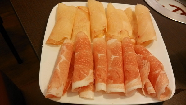 羊雪花-油花的分佈較少,吃起來帶有微微的嚼勁,每一片切的