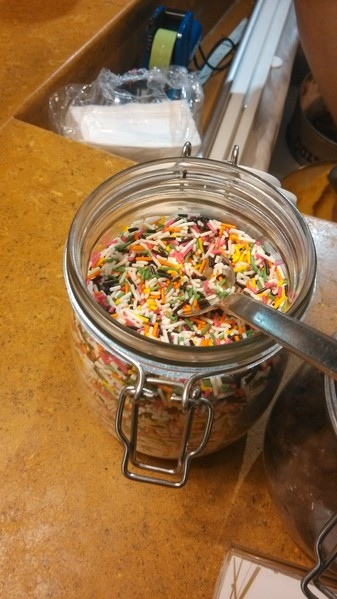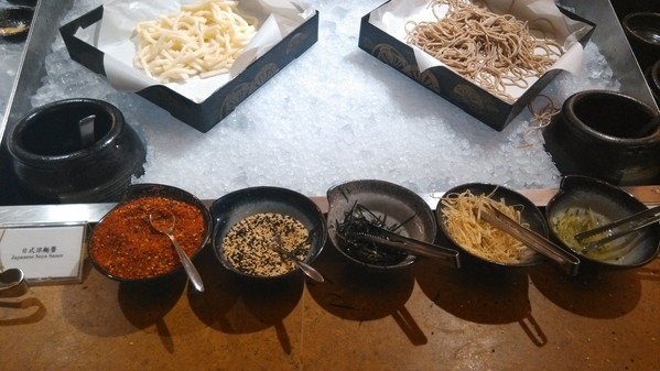 有涼麵醬汁及七味粉、黑白芝麻、海苔絲、蛋絲、