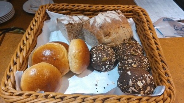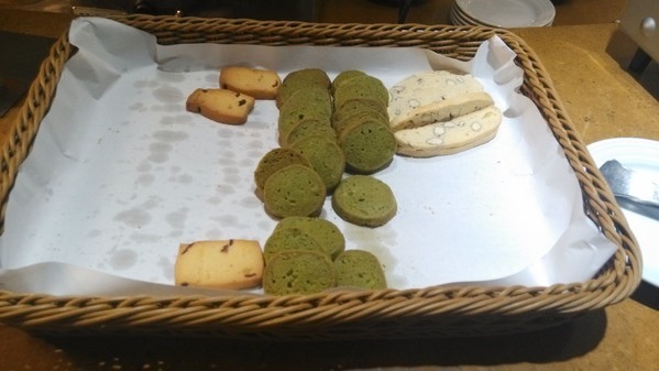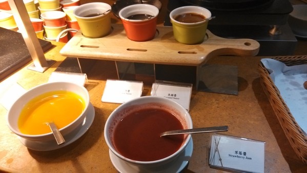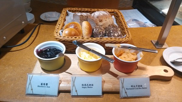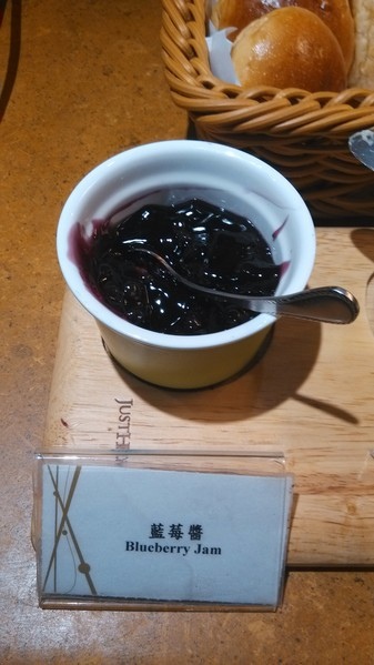 提供三、四款的麵包與藍莓醬、依思尼奶油