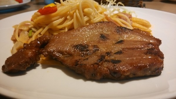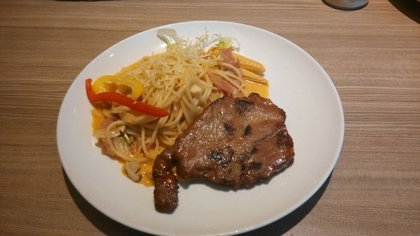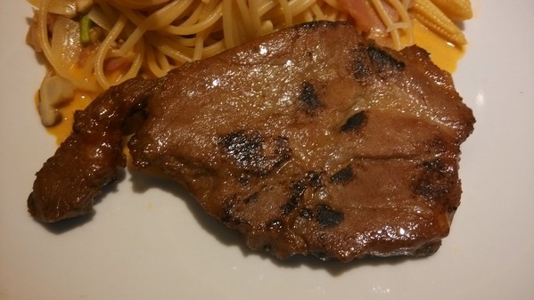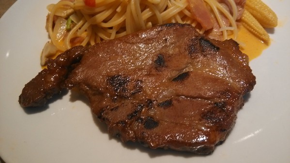 義式培根咖哩豬排義大利麵-厚實又帶點焦香味的一個煎烤豬排