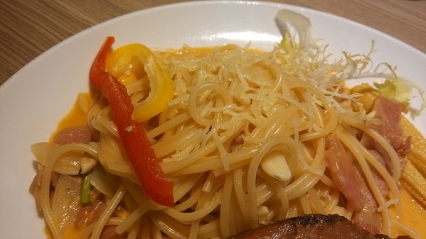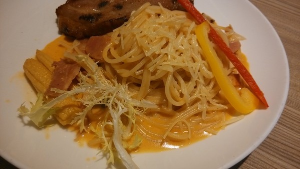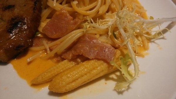 ,搭配Q彈的義大利麵條與清脆的玉米筍及培根、彩椒等配料,