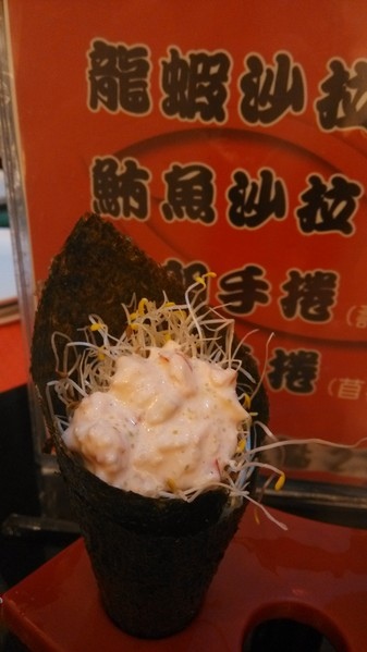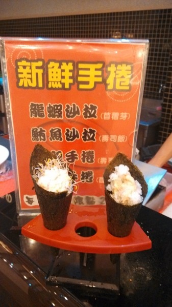 有龍蝦沙拉、鮪魚沙拉、蝦卵手捲、蘆筍手捲四種,其中