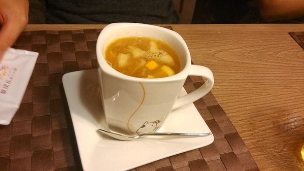 南瓜濃湯-淡淡的南瓜香味與濃稠的湯頭,白色的部分應該是鮮