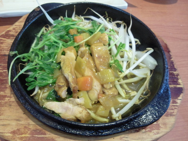 的雞柳淋上加水稀釋的咖哩醬,再放上一些豆芽與豆苗下去的感