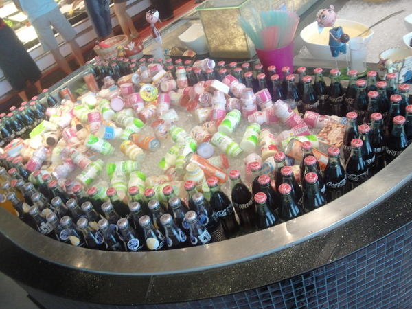 大宗飲料區--有玻璃瓶裝碳酸汽水可樂冰櫃、四種應該不會喝的果