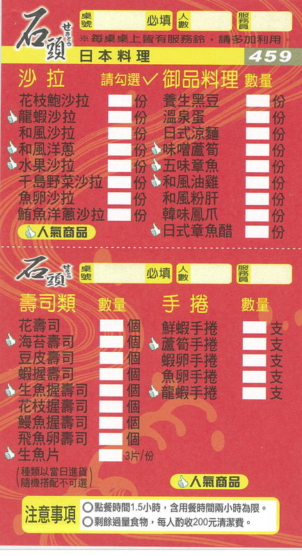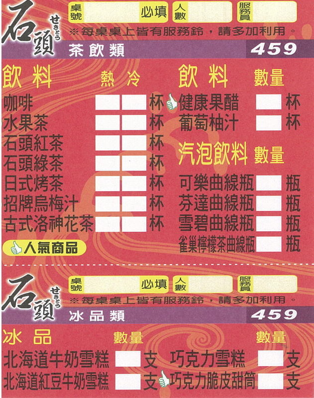 MENU-有359與459兩種價位的餐點,寫完數字和桌號之後按下服務鈴交